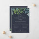 Rustic watercolor forest foliage arrangements in shades of green and blue, rehearsal dinner invitation. Chic and modern typography design. Background features solid dark navy blue colour.