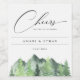 Rustic chic watercolor woodland forest and mountain scene, personalised wine labels. Elegant calligraphy "Cheers" graphic with modern design style template provides lines for names, event date and phrase.