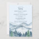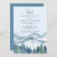 Rustic watercolor blue mountains forest 50th birthday party invitation theme. Solid blue on the back of the invitation.