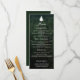 A rustic wedding menu card featuring a scenic forest photo background by Destei and a simple fir tree silhouette at the top for a touch of woodland feel. The elegant script title reads “Menu” with four sections below ideal for listing appetizers, main courses, desserts and beverages. The reverse side offers a green background with the matching fir tree silhouette and a personalizable text area for the couple’s names and wedding date. A perfect choice for outdoor, forest, hiking or nature-inspired wedding receptions.