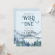 Rustic watercolor forest "wild one" theme 1st birthday party invitation with mountains and trees in hues of blue and green.