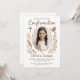 Announce your daughter’s special confirmation with this elegant and rustic photo invitation. Featuring a warm brown botanical wreath, delicate dove and cross icons, and a customisable photo in an arched frame. Perfect for traditional or earthy-themed celebrations.