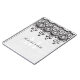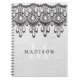 This romantic, feminine grey and black notebook features the look of elegant black lace hanging down over a rustic, grey linen burlap look background. Your monogram initial is in white, and your name is in black.