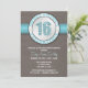 Custom aqua blue Sweet Sixteen (16) milestone Birthday Invitations featuring a printed glitter illustration for the "16" in a "SWEET SIXTEEN CELEBRATION" emblem design, over a rustic dark grey canvas texture image.