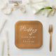 This rustic gold wedding paper plate features elegant white typography overlaid on an understated earth tone gradient. Simple light orange and brown hues follow the current fall trends for a bohemian wedding reception this autumn. Complete the look with your minimalist script over the colour fade.