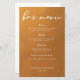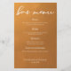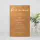 This rustic gold wedding bar menu features elegant white typography overlaid on an understated earth tone gradient. Simple light orange and brown hues follow the current fall trends for a bohemian wedding this autumn. Complete the look with your minimalist script over the colour fade on this drinks list.