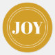 Classic rustic Joy round sticker. White text within a white double round boarder, gold background.
