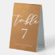 This rustic gold wedding table number on a tabletop sign features elegant white typography overlaid on an understated earth tone gradient. Simple light orange and brown hues follow the current fall trends for a bohemian wedding this autumn. Complete the look with your minimalist script over the colour fade.