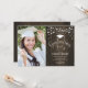 Rustic graduation party invitation with your photo. Features wood pattern, string fairy lights, script font and a tassel cap.