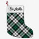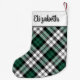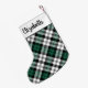 Christmas stocking features a modern personalised monogram design with a classic green and white black watch Scottish tartan plaid patterned background. Personalise the custom script text with each family member name. Includes the same design on both sides of the stocking.