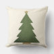 Holiday throw pillow features a simple Christmas tree design with a textured appearance. The tree has a rustic green look, the wood is kraft brown, and the star adds a touch of sparkle with a gold glitter look. A pattern of wide horizontal green and soft white / light ivory stripes dresses up the back of the pillow.