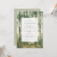 A rustic watercolor forest landscape in shades of green and gold provides the background for the charcoal grey text on a white rectangular screen. The reverse side provides space for wedding details on a solid green background, along with a QR code guests can scan to visit your website and RSVP, which saves the cost of printing and mailing separate RSVP cards.