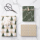 A collection of coordinated holiday wrapping papers. One features a beige gingham background with a dark green Christmas tree pattern, the second is a beige background with a white polka dot pattern and the third is a coordinating dark green with merry christmas in white typography. Mix and match.