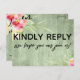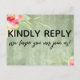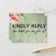 Both the back and front were accented with pretty, colourful watercolor flowers. In editable text "kindly reply" was placed, large and bold, on the front. In a modern casual handwriting, a graphic depicting "we hope you can join us!" appears below. On the back, the same unique font was used to create graphics that read "rsvp", "m", "kindly deliver to:" and "menu choice for each guest:" All other text is editable. Use the template fields to personalise as much as you wish. The background is covered in rustic green wood imagery. // 100 //