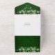 All in one wedding invitation featuring pretty string lights, a hand-drawn floral garland and chic typography on a rustic emerald green wood panels background. The invitation includes a perforated RSVP with your wedding website QR code and details. Designed by Thisisnotme©