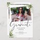 This elegant botanical greenery leaves graduation announcement can be personalised with your information in chic typography with your 2 special grad photo. Designed by Thisisnotme©