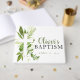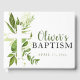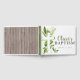 A white cross surrounded by greenery leaf blooms adorns the cover of this baptism guest book. Accented by a faux wood backing and olive green accents. Perfect for a Baptism reception.