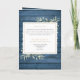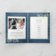 A personalised order of service funeral memorial folded program featuring greenery on a rustic blue wood panels background. Designed by Thisisnotme©