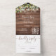 All in one wedding invitation featuring greenery foliage, pretty string lights, mason jars, signature style names and chic typography on a rustic wood background. The invitation includes a perforated RSVP card that’s can be individually addressed or left blank for you to handwrite your guest's address details. Designed by Thisisnotme©