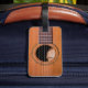 Detail guitar photo of strings and sound hole on a worn acoustic guitar.