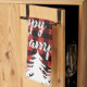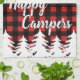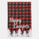 Rustic buffalo check plaid in red and black kitchen towel featuring the phrase "Happy Campers" and white trees.