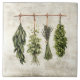 Rustic green herbs hanging to dry o a twig with twine. Shabby chic decor for your home. Perfect for your country French or cottage farmhouse kitchen. Faux texture background.