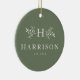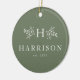 Your initial surrounded by festive branches along with last name and year or date of marriage in white against a stylish sage green background (colour can be edited by clicking "customise"). With a photo on the back, this ornament is perfect for the newlywed couple.