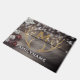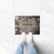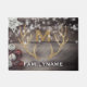 Country chic, gold glitter deer antlers personalised doormat perfect for a country Christmas holiday- Rustic, old barn wood photo background with country style Christmas star ornament and red and white jingle bells on the left. Personalised family name at the bottom in elegant letters. Monogram initial with a shadow effect is centred above a pair of festive, gold glitter buck deer antlers. Rustic, white snowflakes are scattered over the top half and have a worn, stamped effect. Rustic holiday welcome for guests in front of a cosy log cabin. Country chic, monogrammed winter holiday housewarming gift, family Christmas gift, or unique Christmas wedding shower gift for the newlyweds. Note: All images are printed. Not actual glitter or wood. Elegant decor for the winter holidays or for deer hunters or animal lovers. Spruce up your front porch with a gold glitter holiday or winter woodland forest animal theme!