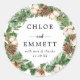 Elegant rustic winter wedding favour seal. The wedding couple's first names are in the centre with a short thank you and date. They are surrounded by a traditional pine and holly wreath. The wreath has a variety of greenery such as pine, spruce and holly. Red berries give it a pop of festive colour. White cotton flowers give in a modern vibe and brown pinecones add a country texture. This wedding thank you sticker is included in the Holly and Pine White Floral collection. Feel free to message me, if you need help finding coordinating items.