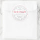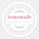 The Rustic Homemade Green Kitchen label features a crisp white background with stitched-circle detailing and soft green botanical accents, beautifully paired with a bold red “homemade” script. Perfect for labelling baked goods, jams, preserves, canning jars, treat bags, and homemade gifts, this round sticker adds a warm, personal touch to anything made with love. The fresh green elements bring a cheerful, natural feel—ideal for home bakers, cottage food makers, and seasonal gifting.