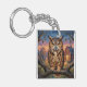 A keychain that features a striking Great Horned Owl, rendered in a rich, thick impasto oil painting style. The vibrant textures and warm sunset backdrop create a cozy, rustic atmosphere that is perfect for nature lovers and art enthusiasts alike.