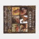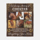 Personalised horse photo fleece blanket featuring 6 precious pictures of your beloved pet animal, a rustic wooden background, gold horseshoes & glitter, the text "in loving memory of", your horses name, birth/death dates, and the sympathy quote "your presence we miss, your memory we treasure, loving you always, forgetting you never".