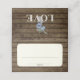 Rustic jar with blue flowers over barn wood background, folded seating card with white area for hand writing names and table number and personalised names and message on reverse side.