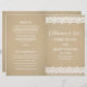 Wedding sheet programs feature "Celebration of Love" in script, a charming illustrated border design of vintage white floral and dotted lace, and a background with a rustic kraft brown paper textured appearance. Personalise the custom text for your bridal party, ceremony information, and thank you message. Note: these text weight paper programs arrive flat and require folding to assemble.