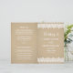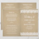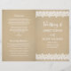 Delicate white lace trim frames a warm kraft background on this rustic ceremony program. "Wedding Of" appears in elegant typography, framing your names and wedding details for a romantic country-inspired design, with a coordinating lace-trimmed backing. Inside pages are fully customisable for your bridal party, ceremony order, and a personal thank you message on the back cover. Programs are printed on text-weight paper and arrive flat, requiring a simple centre fold.