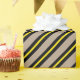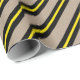 A rustic kraft coloured holiday wrapping paper featuring black and centred yellow wide stripes.