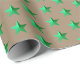 A rustic kraft wrapping paper for the Christmas holiday featuring green stars in a repeat pattern on a warm kraft paper.