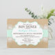 Rustic baby shower invitation card design with sea foam contrast and white lace over kraft paper texture background.