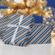 A rustic kraft coloured holiday wrapping paper featuring navy blue with centred white wide stripes.