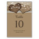 Rustic kraft paper wedding table numbers featuring two burlap hearts against a kraft paper, burlap and lace background adorned with string lights. Easy to personalise template.