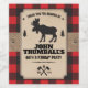 A background of red buffalo plaid contrasts against a kraft paper look panel held on by a burlap strap. The panel holds the party information featuring a moose between two pine trees. Great for a birthday, bachelor party, seasonal event, or a plaid or lumberjack themed celebration. The crossed axe makes a custom logo below. Available with matching products.