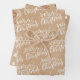 A set of holiday designs with hand script "Merry Christmas" and "Happy Holidays" and Christmas trees, on textured kraft paper background, best for the holiday season gift wrapping.