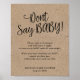 This cute baby shower game sign features a script heading and your custom text on a kraft coloured background. Use the template form to add your personalisation. How to Play: Hang the poster at your shower. When the guests arrive, give them a clothespin and remind them not to say "BABY" or they will lose their pin! It's so easy, anyone can play. Give a prize to the guest who collects the most clothespins at the end of the shower.