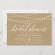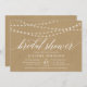 Our rustic elegant bridal shower invitations feature a kraft background with strings of white lights across the top, and "bridal shower" in chic calligraphy script typography. Personalise with your bridal shower and registry details beneath in white lettering.