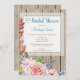 A charming rustic bridal shower invitation featuring a pretty pink rose bouquet on a wood background with white lace frame. Perfect for a country bridal shower theme.