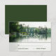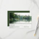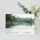 This rustic lakeside evergreens wedding RSVP card, created from my own personal kayaking photograph and with a subtle digital watercolor effect, features a beautiful rustic scene under an overcast sky with lightly rippled but calm water reflecting distant evergreens, cedar trees and rock structures, perfect for a mountain, lakeside, or riverside wedding celebration - by katz_d_zynes