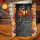 Birthday celebration design featuring a beautiful autumn lantern with lit candle as a centerpiece to a table arrangement of beautiful fall leaves in vibrant autumn splendour. The background features a chalkboard distressed design flanked on either side with gorgeous fall leaves, and backed by a rustic washed wood planks look background. Composite design by Holiday Hearts Designs.
