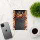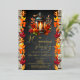Birthday celebration design featuring a beautiful autumn lantern with lit candle as a centerpiece to a table arrangement of beautiful fall leaves in vibrant autumn splendour. The background features a chalkboard distressed design flanked on either side with gorgeous fall leaves, and backed by a rustic washed wood planks look background. Composite design by Holiday Hearts Designs.