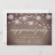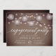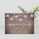 Our rustic elegant engagement party invitations feature a dark kraft background with strings of white lights and luminous paper lanterns across the top, and "engagement party" in chic calligraphy script typography. Personalise with your engagement celebration details beneath in white lettering.