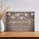 Our festive surprise party invitations feature a dark kraft background crisscrossed with strings of glowy white lights and luminous paper lanterns, and "surprise party" in chic calligraphy script typography. Personalise with your surprise celebration details beneath in white; can be used for any occcasion, like birthday parties or anniversary parties. A chic design in dark navy and white for elegant events.